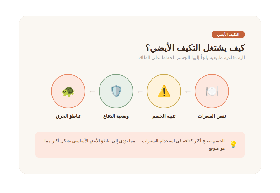 وهي آلية دفاعية طبيعية، موجودة في كل إنسان، يلجأ إليها الجسم تلقائياً لما يحس بنقص في الطاقة الداخلة. الجسم ما يفهم مفهوم “الدايت” ما يعرف إنك تحاولي تخسري وزن بشكل اختياري. اللي يفهمه هو إن الطاقة اللي تدخل قلّت، فيبدأ يتصرف على أساس إن في خطر.